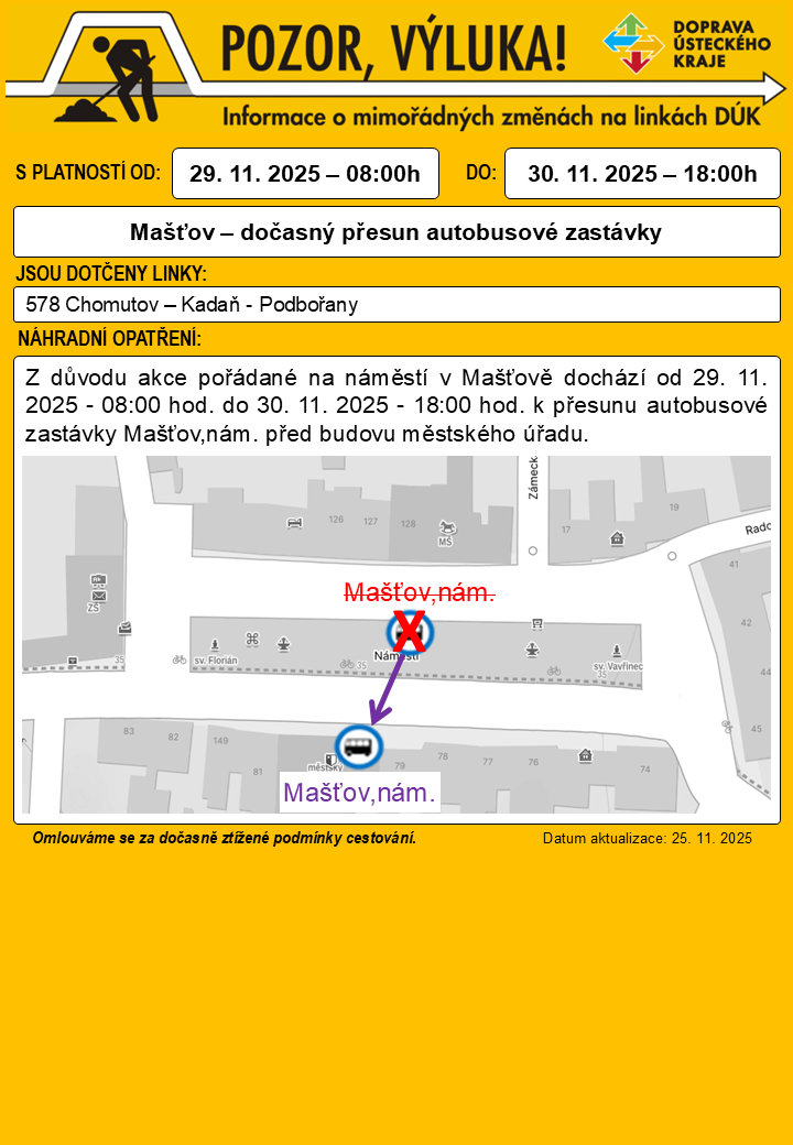 Z důvodu akce pořádané na náměstí v Mašťově dochází od 29. 11. 2025 - 08:00 hod. do 30. 11. 2025 - 18:00 hod. k přesunu autobusové zastávky Mašťov,nám. před budovu městského úřadu.