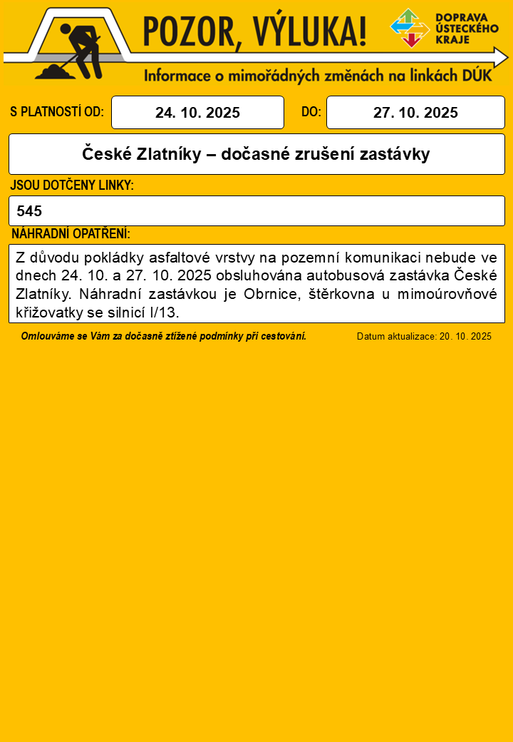 Z důvodu pokládky asfaltové vrstvy na pozemní komunikaci v Českých Zlatníkách dochází ve dnech 24. 10. a 27. 10. 2025 k výluce autobusové linky 545.