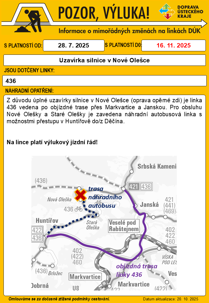 Uzavírka silnice ve Staré Olešce v souvislosti s opravou opěrné zdi je PRODLOUŽENA do 16. 11. 2025.