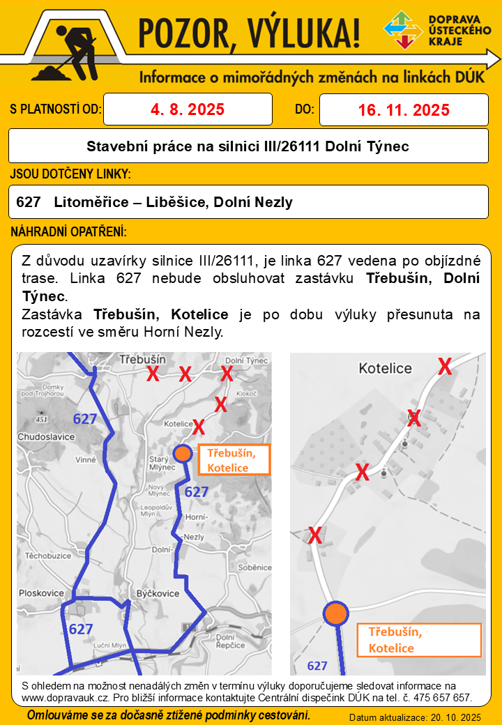 Linka 627 - prodloužení uzavírky u Dolního Týnce