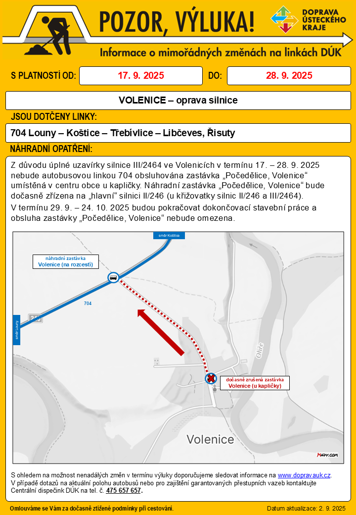 Z důvodu opravy silnice III/2464 ve Volenicích na Lounsku bude dočasně přemístěna zastávka "Počedělice, Volenice" ke křižovatce silnic II/246 a III/2464. Jízdní řád linky 704 se nezmění.