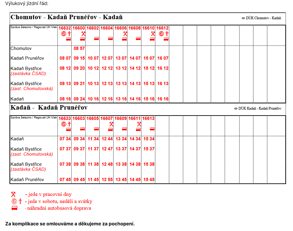 Z tohoto důvodu nahradí ČD, a.s., dotčené vlaky linky U1 náhradní autobusovou dopravou v úseku Kadaň-Prunéřov - Kadaň a zpět.