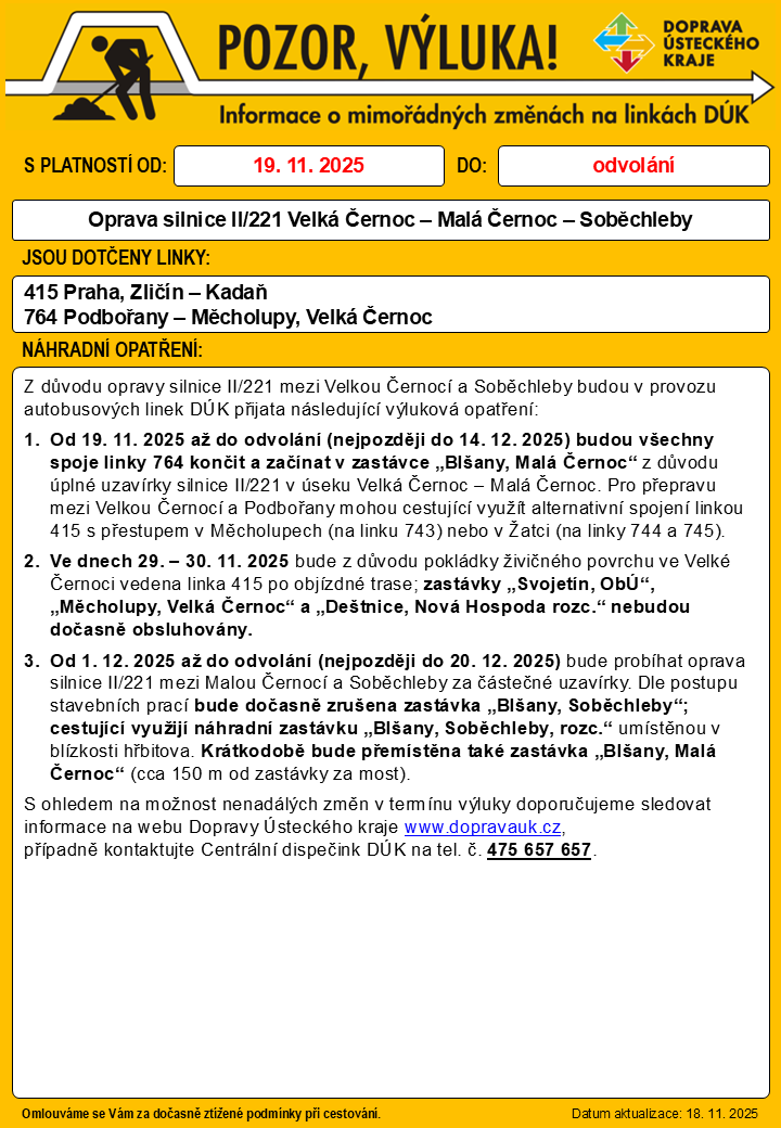 Z důvodu opravy silnice II/221 budou v provozu autobusových linek DÚK 415 a 764 přijata následující výluková opatření.