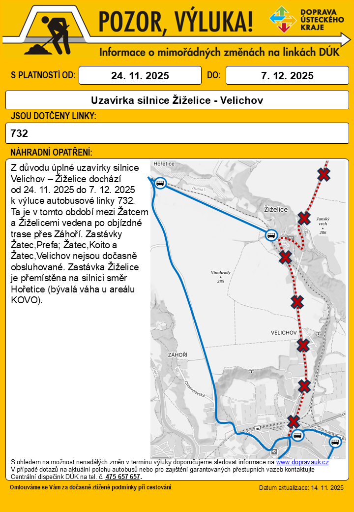 Z důvodu úplné uzavírky silnice I/27 mezi Žiželicemi a Velichovem dochází od 24. 11. do 7. 12. 2025 k výluce autobusové linky 732.