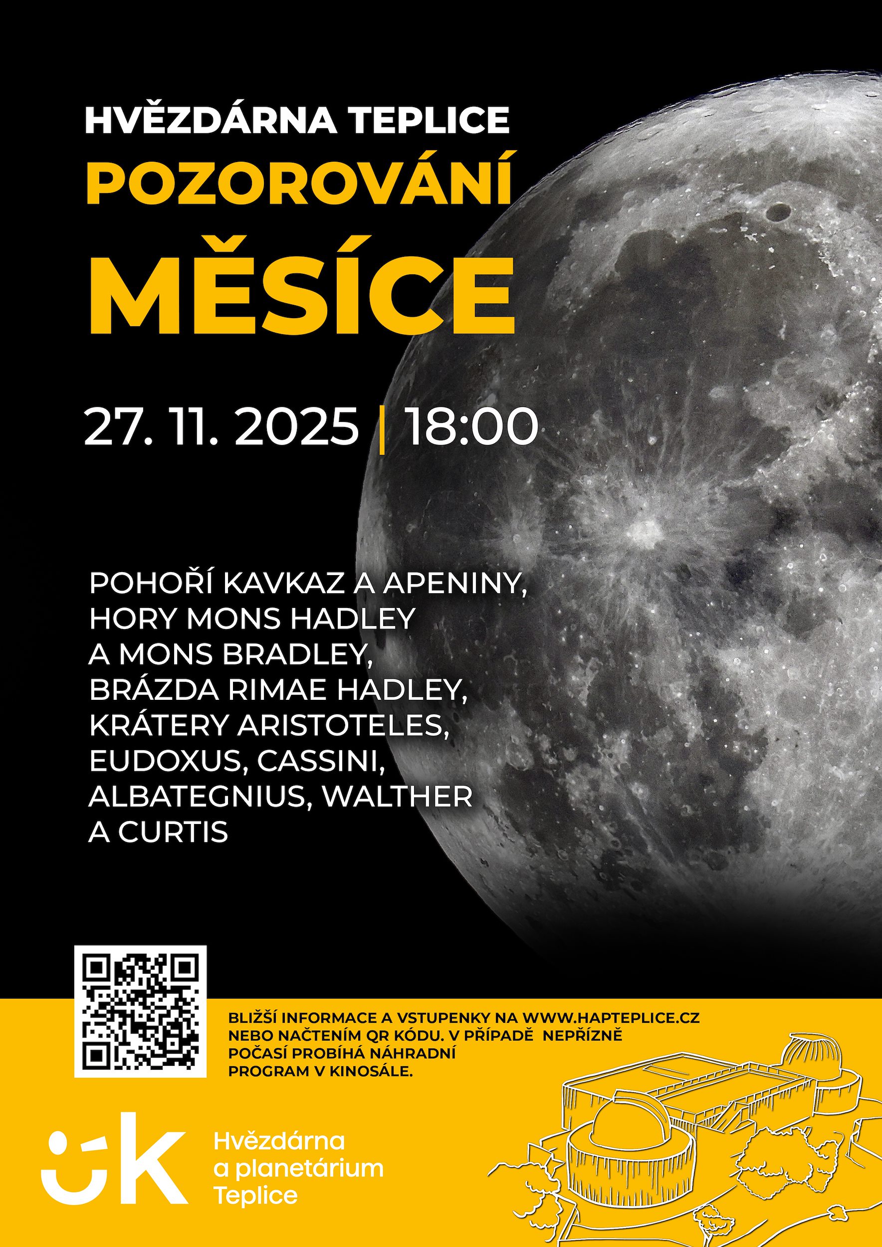 Myslíte, že lze z Teplic dohlédnout až na Kavkaz či Apeniny? Inu, za dobrého počasí to možné je! Přijďte se přesvědčit na hvězdárnu v Teplicích, kde každý měsíc pozorujeme konkrétní útvary na povrchu Měsíce.